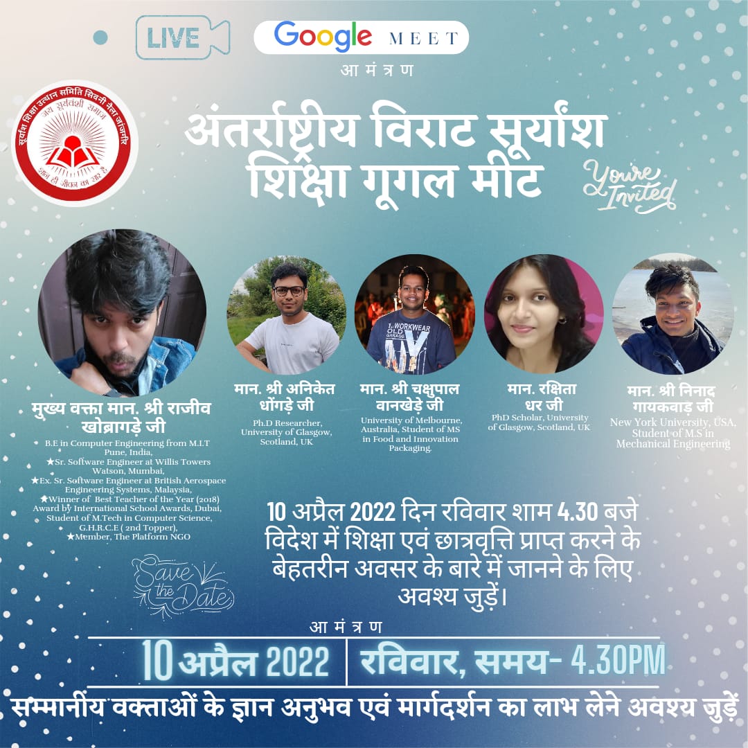 जाज्वल्य न्यूज़:: जांजगीर चांपा::विदेशों में शिक्षा, छात्रवृत्ति एवं रोजगार के अवसर: चुनौती एवं संभावनाएं” शीर्षक पर एक राष्ट्रीय वेबीनार का आयोजन 10 अप्रैल रविवार को सूर्यांश शिक्षा उत्थान समिति द्वारा किया जा रहा है। इस वेबीनार में विदेशों में शिक्षा प्राप्त कर छात्रवृत्ति एवं रोजगार प्राप्त करने से संबंधित अवसरों और चुनौतियों के बारे में विस्तृत जानकारी प्रदान किया जाएगा। वेबीनार गूगल मीट प्लेटफार्म पर शाम 4:30 बजे से प्रारंभ होगा जिसमें विदेशों में अध्ययनरत विभिन्न विश्वविद्यालयों के शोधार्थी छात्र-छात्राओं का मार्गदर्शन करेंगे।