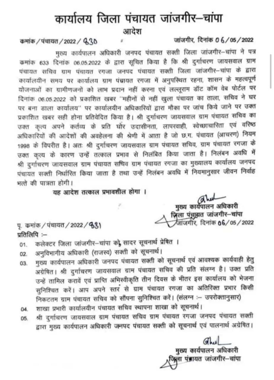 मुख्यमंत्री भूपेश बघेल के दौरे को लेकर जिले के अफसर सक्रिय हो गए हैं और धड़ाधड़ कार्रवाई भी कर रहे हैं। जिला पंचायत सीईओ ने सक्ती के ग्राम पंचायत रजगा सचिव को अनुपस्थित रहने सहित अन्य कारणों से निलंबित कर दिया। इस पर पंचायत सचिव ने सवाल उठाते हुए कहा कि अवकाश के दौरान उसे अनुपस्थित बताकर निलंबित किया गया है।