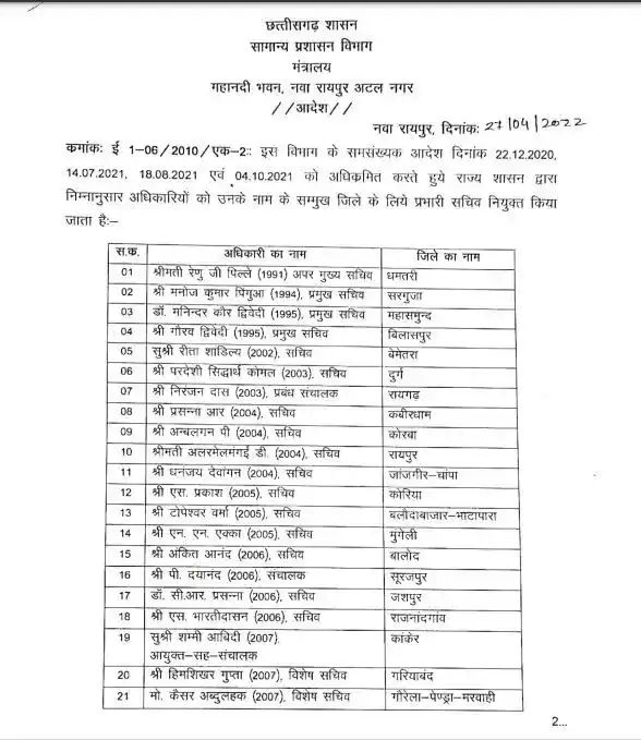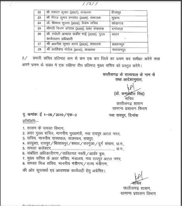 इस आदेश में 28 आईएएस अधिकारियों को अलग-अलग जिलों का प्रभारी सचिव नियुक्त किया गया है। यह अधिकारी उन जिलों के विकास कार्य और सरकारी योजनाओं के क्रियान्वयन की मॉनिटरिंग भी करेंगे। लिस्ट में आईएएस अलरमेल मंगई डी को रायपुर, गौरव द्विवेदी को बिलासपुर और सिद्धार्थ कोमल परदेशी को दुर्ग जिले की जिम्मेदारी दी गई है। लिस्ट में अन्य अधिकारियों के भी नाम शामिल है, जिन्हें जिलों का प्रभारी सचिव बनाया गया है।