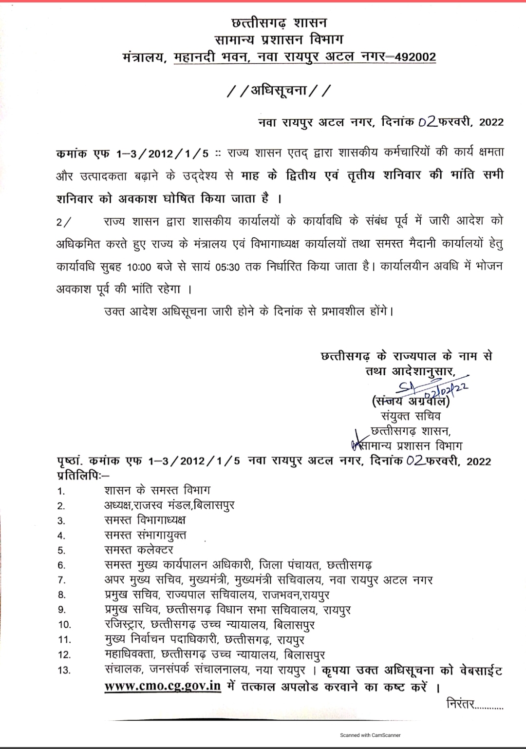 जांजगीर-चांपा::जाज्वल्य न्यूज़::भूपेश बघेल द्वारा गणतंत्र दिवस के अवसर पर शासकीय कर्मचारियों की कार्यक्षमता और उत्पादकता बढ़ाने के लिए पांच कार्य दिवस प्रति सप्ताह प्रणाली प्रारंभ करने की घोषणा की गई थी। मुख्यमंत्री की घोषणा के तारतम्य में आज सामान्य प्रशासन विभाग द्वारा मंत्रालय से अधिसूचना जारी कर दी गई है। जारी अधिसूचना में कहा गया है कि राज्य शासन द्वारा शासकीय कर्मचारियों की कार्यक्षमता और उत्पादकता बढ़ाने के उद्देश्य से माह के द्वितीय एवं तृतीय शनिवार की भांति सभी शनिवार को अवकाश घोषित किया जाता है। अधिसूचना में यह भी कहा गया है कि राज्य के मंत्रालय एवं विभागाध्यक्ष कार्यालयों तथा समस्त मैदानी कार्यालयों हेतु कार्यावधि सुबह 10 बजे से सायं 5.30 तक निर्धारित की जाती है। कार्यालयीन अवधि में भोजन अवकाश पूर्व की भांति रहेगा। यह आदेश अधिसूचना जारी होने के दिनांक से प्रभावशील होगा।