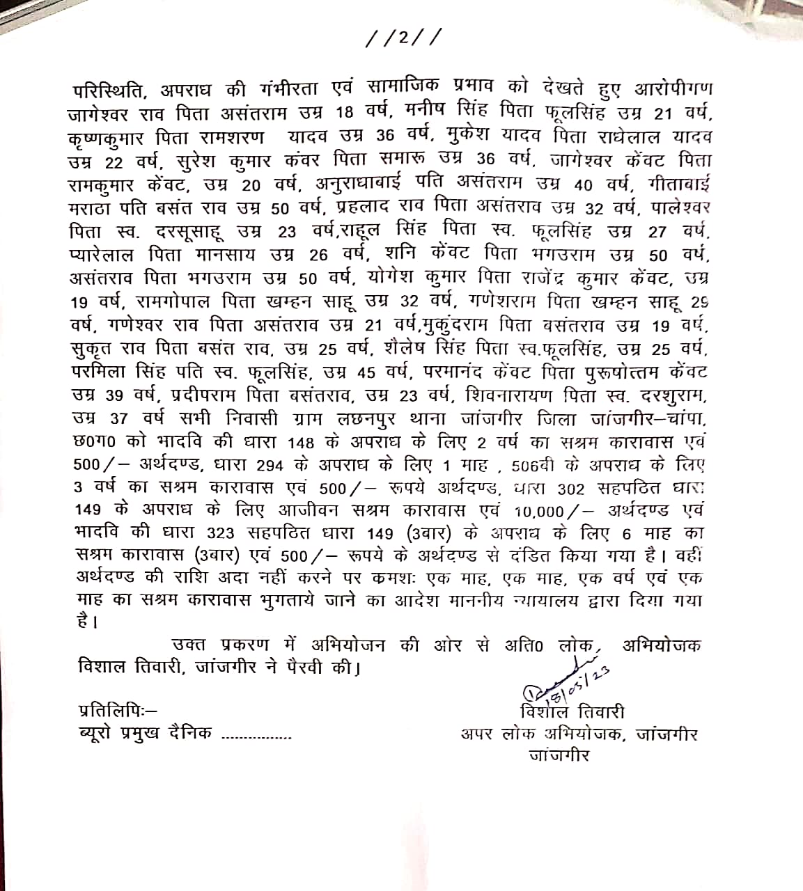 परिस्थिति, अपराध की गंभीरता एवं सामाजिक प्रभाव को देखते हुए आरोपीगण जागेश्वर राव पिता असंतराम उम्र 18 वर्ष, मनीष सिंह पिता फूलसिंह उम्र 21 वर्ष, कृष्णकुमार पिता रामशरण यादव उम्र 36 वर्ष, मुकेश यादव पिता राधेलाल यादव उम्र 22 वर्ष, सुरेश कुमार कंवर पिता समारू उम्र 36 वर्ष, जागेश्वर केंवट पिता रामकुमार केंवट, उम्र 20 वर्ष, अनुराधाबाई पति असंतराम उम्र 40 वर्ष, गीताबाई मराठा पति बसंत राव उम्र 50 वर्ष, प्रहलाद राव पिता असंतराव उम्र 32 वर्ष, पालेश्वर पिता स्व. दरसूसाहू उम्र 23 वर्ष राहूल सिंह पिता स्व. फूलसिंह उम्र 27 वर्ष, प्यारेलाल पिता मानसाय उम्र 26 वर्ष, शनि केंवट पिता भगउराम उम्र 50 वर्ष, असंतराव पिता भगउराम उम्र 50 वर्ष, योगेश कुमार पिता राजेंद्र कुमार केवट, उम्र 19 वर्ष, रामगोपाल पिता खम्हन साहू उम्र 32 वर्ष, गणेशराम पिता खम्हन साहू 25 वर्ष, गणेश्वर राव पिता असंतराव उम्र 21 वर्ष, मुकुंदराम पिता वसंतराव उम्र 19 वर्ष, सुकृत राव पिता बसंत राव, उम्र 25 वर्ष, शैलेष सिंह पिता स्व. फूलसिंह, उम्र 25 वर्ष, परमिला सिंह पति स्व. फूलसिंह, उम्र 45 वर्ष, परमानंद केंवट पिता पुरुषोत्तम केंवट उम्र 39 वर्ष, प्रदीपराम पिता वसंतराव, उम्र 23 वर्ष, शिवनारायण पिता स्व. दरशुराम, उम्र 37 वर्ष सभी निवासी ग्राम लछनपुर थाना जांजगीर जिला जांजगीर-चांपा. छ०ग० को भादवि की धारा 148 के अपराध के लिए 2 वर्ष का सश्रम कारावास एवं 500/- अर्थदण्ड, धारा 294 के अपराध के लिए 1 माह 506बी के अपराध के लिए 3 वर्ष का सश्रम कारावास एवं 500 /- रूपये अर्थदण्ड, धारा 302 सहपठित धारा 149 के अपराध के लिए आजीवन सश्रम कारावास एवं 10,000 / – अर्थदण्ड एवं भादवि की धारा 323 सहपठित धारा 149 (3वार) के अपराध के लिए 6 माह का सश्रम कारावास ( उबार) एवं 500 /- रूपये के अर्थदण्ड से दंडित किया गया है। वहीं अर्थदण्ड की राशि अदा नहीं करने पर क्रमशः एक माह एक माह एक वर्ष एवं एक माह का सश्रम कारावास भुगताये जाने का आदेश माननीय न्यायालय द्वारा दिया गया है ।