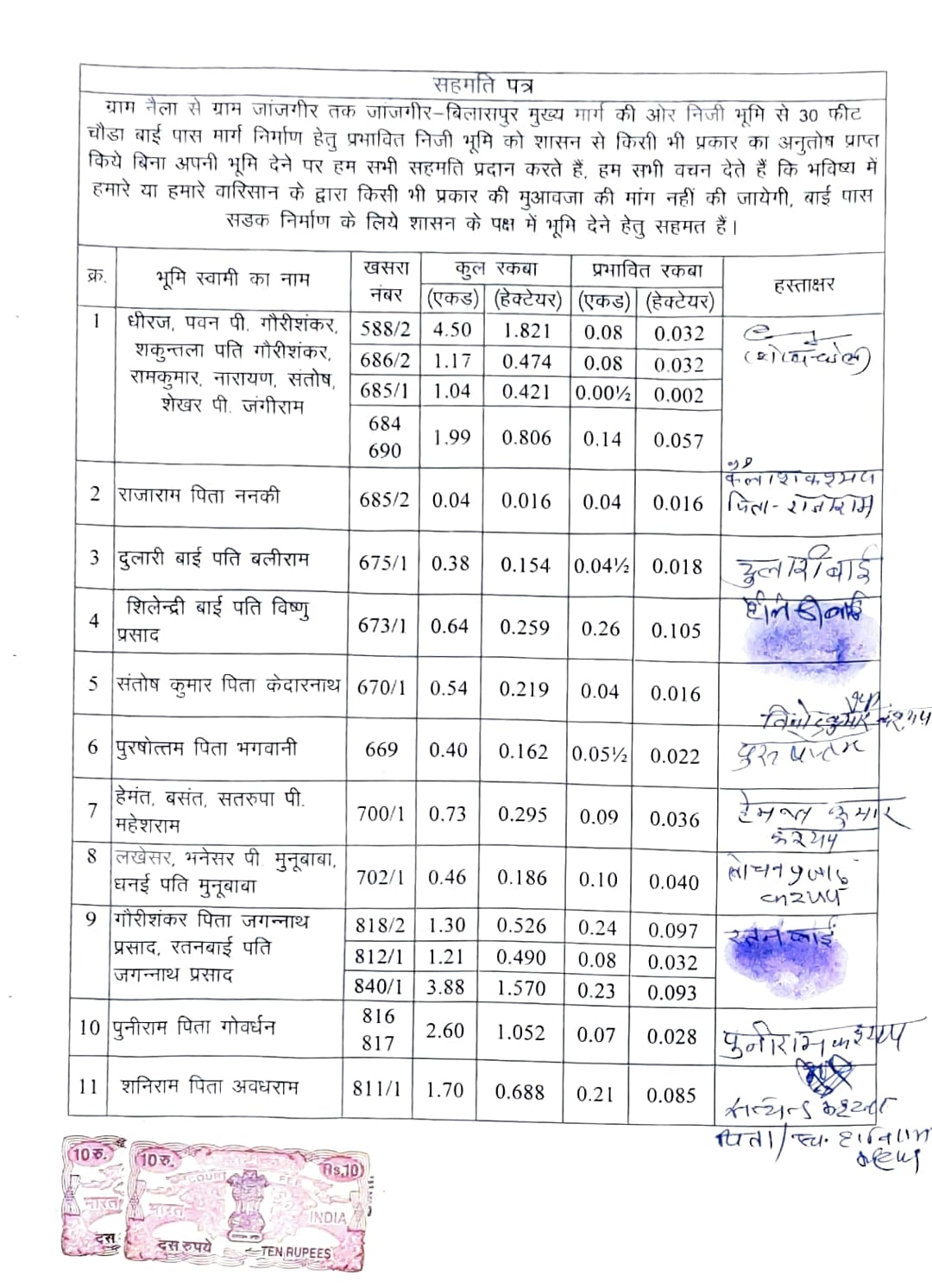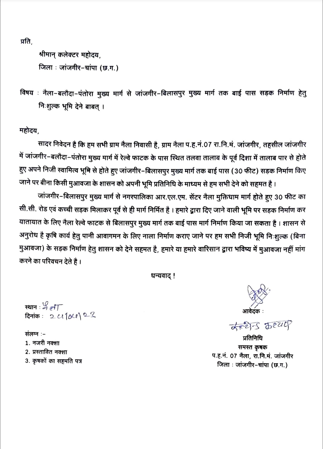 जिला मुख्यालय जांजगीर नैला के कृषको ने मिलकर 1 किलोमीटर बाईपास और 30 फीट चौड़ी सड़क निर्माण के लिए भूमि दान करने शपथ पत्र एवं नजरी नक्शा खसरा रकबा सहित भूस्वामी के सहमति से के सहमति से नायला बलौदा 15 मुख्य मार्ग से जांजगीर बिलासपुर मुख्य मार्ग तक बाईपास सड़क निर्माण निशुल्क शासन को देने निर्णय लिया जिसमें मुख्य भूस्वामी विधानसभा नेता प्रतिपक्ष नारायण चंदेल सहित रामकुमार रामकुमार संतोष शेखर पिता जंगी राम चंदेल धीरज पवन पिता गौरी शंकर शकुंतला पति गौरीशंकर,राजाराम पिता ननकी दुलारी बाई पति बलीराम शैलेंद्र भाई पति विष्णु प्रसाद संतोष कुमार पिता केदारनाथ पुरुषोत्तम पिता भगवानी हेमंत बसंत सतरूपा पिता महेश राम लखेसर धनेश्वर पिता मनु बाबा धनी प्रति मनु बाबा गौरी शंकर पिता जगन्नाथ प्रसाद रतन भाई पति जगन्नाथ प्रसाद सनी भाई पिता गोवर्धन शनी राम पिता अवधराम ने मिलकर सहमति प्रदान करते हुए जिला प्रशासन को जमीन सड़क निर्माण हेतु सौंपकर जनहित की बड़ी समस्या जो सैकड़ों गांव को जोड़ने बाईपास रोड से आवागमन करने वाले राहगीरों को निजात दिलाने जिला सहित प्रदेश भर में मिसाल पैदा किए हैं वही एक और एक 1 फीट जमीन के लिए जद्दोजहद करने वाले शहरवासियों के लिए भी यह प्रेरणा बन गई है भूस्वामी एवं रिश्तेदारों द्वारा शपथ पत्र प्रस्तुत कर बताया गया कि भविष्य में किसी तरह की मुआवजा की मांग नहीं की जाएगी पूर्णता निशुल्क प्रदान करने के निर्णय लिया गया है।