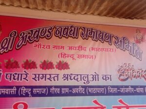 जांजगीर-चांपा::जाज्वल्य न्यूज़::नवागढ़ जनपद के आयुर्वेद ग्राम अवरीद भाठापारा(सेमरा)में लगातार 27 वा वर्ष हिन्दू समाज अखण्ड नवधा रामायण का आयोजन बड़े धूमधाम से किया जा रहा है मानस प्रेमी राम कथा रसपान का आनन्द लेने पंडाल पहुँच रहे नवधा रामायण छत्तीसगढ़ की संस्कृति में विशेष मानी जाती है इसी के अनुरुप अनेक गांवो में प्रति वर्ष की तरह नवधा रामायण का आयोजन किया जाता है लगातार 9 दिनों तक संगीत के साथ रामभक्तो को कथा सुनने का अवसर प्राप्त होता है ग्राम अवरीद में मानस गायन करने मानस मंडली