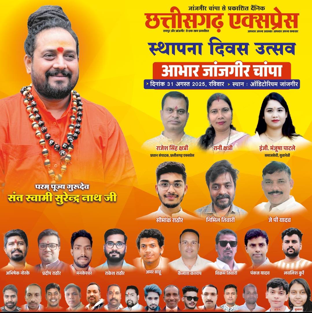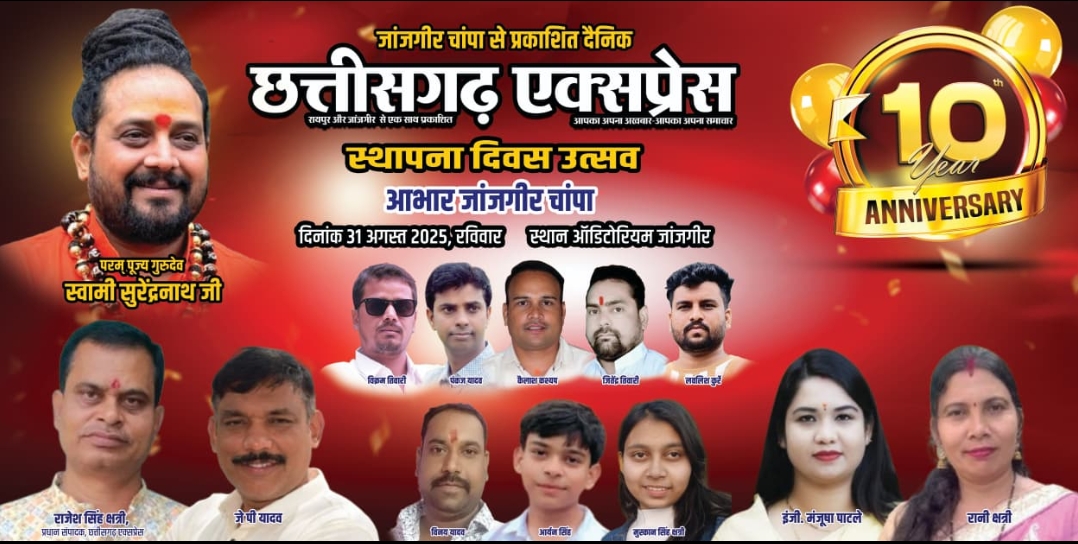 जांजगीर-चांपा दैनिक छत्तीसगढ़ एक्सप्रेस अपना 10वां स्थापना दिवस इस बार भव्य रूप से मनाने जा रहा है। तैयारियों की गूंज जिलेभर में सुनाई दे रही है और पाठकों में उत्साह साफ झलक रहा है।