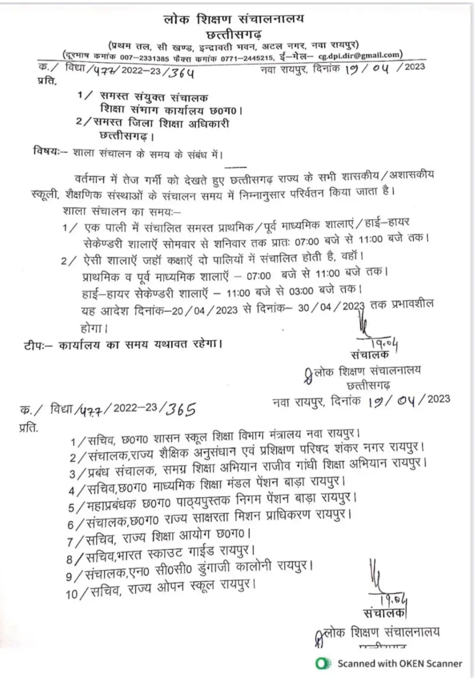 लोक शिक्षण संचालनालय की तरफ से बुधवार को जारी आदेश के मुताबिक. एक पाली में संचालित सभी प्राथमिक/पूर्व माध्यमिक शालाएं/हाई-हायर सेकेण्डरी स्कूल सोमवार से शनिवार तक सुबह 07 बजे से 11 बजे तक संचालित होगी. इसके अलावा ऐसी स्कुलें जहां कक्षाएं दो पालियों में संचालित होती है, वहां प्राथमिक व पूर्व माध्यमिक स्कूल सुबह 07 बजे से 11 बजे तक संचालित होगी और हाई-हायर सेकेण्डरी क्लास सुबह 11 बजे से दोपहर 03 बजे तक संचालित होगी. आदेश में ये भी बताया गया है कि कार्यालय का समय पहले की ही तरह रहेगा.