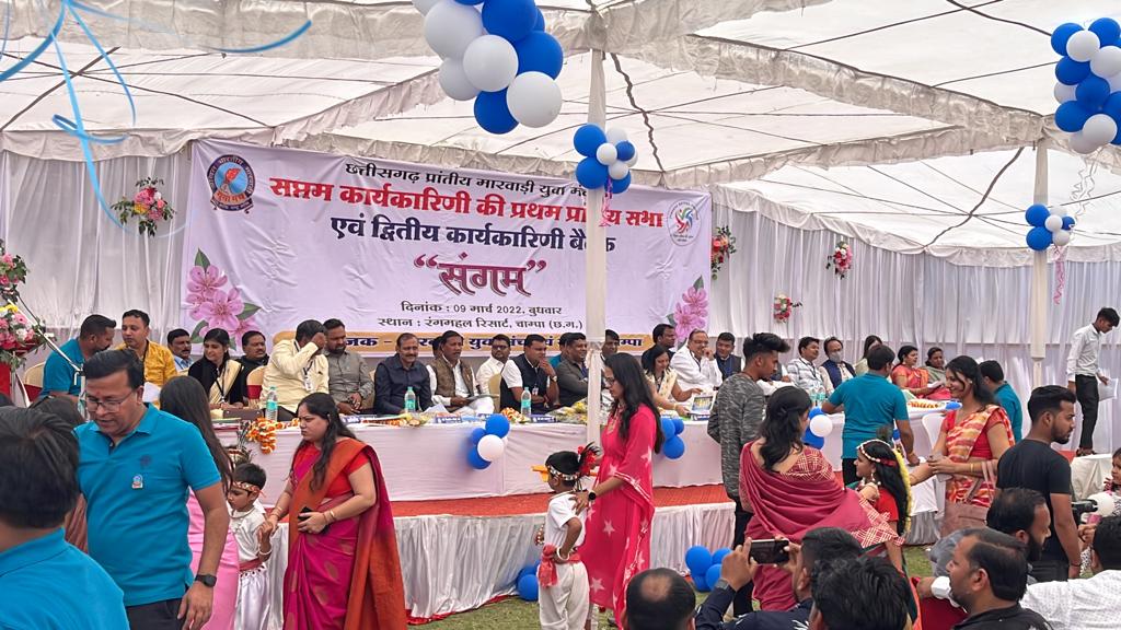 छत्तीसगढ़ प्रांतीय मारवाड़ी युवा मंच की सप्तम प्रांतीय कार्यकारिणी की बैठक एवं सभा का आयोजन 9 मार्च को चांपा शाखा एवं चांपा स्पंदन शाखा के संयुक्त आतिथ्य में कोसा, कासा कंचन की नगरी चांपा शहर के रंग महल रिसोर्ट परिसर में किया गया, सर्वप्रथम श्री गणेश जी के चित्र पर दीप प्रज्ज्वलन एवं नन्हे-मुन्ने बच्चों द्वारा लोक नृत्य की प्रस्तुति के साथ हुआ । इस दौरान मंच पर उपस्थित अतिथियों में राष्ट्रीय अध्यक्ष कपिल लखोटिया, कार्यक्रम की अध्यक्षता प्रांतीय अध्यक्ष अमर सुल्तानिया, राष्ट्रीय उपाध्यक्ष अर्चना गर्ग, राष्ट्रीय चैयरमैन सुनील जैन, प्रांतीय महामंत्री राज अग्रवाल, मुख्य अतिथि के रुप में पूर्व नगरपालिका अध्यक्ष व वरिष्ठ कांग्रेस नेता राजेश अग्रवाल, ओम सिटी चांपा के डायरेक्टर संजय अग्रवाल, आशीष गोयल, राष्ट्रीय सदस्य पुरषोत्तम सिंघानिया, राष्ट्रीय सदस्य हरिओम अग्रवाल, राष्ट्रीय संयोजक प्रशांत गांधी, नीरज अग्रवाल, प्रांतीय पदाधिकारी मनीष अग्रवाल, रीना केडिया, पूर्व प्रदेश अध्यक्ष पितांबर अग्रवाल, जयकिशन अग्रवाल, मंडलीय उपाध्यक्ष शलभ अग्रवाल, विक्रांत अग्रवाल, सुमित मित्तल, संगीता मित्तल, ऋषभ केडिया प्रमुख रूप से मौजूद थे ।