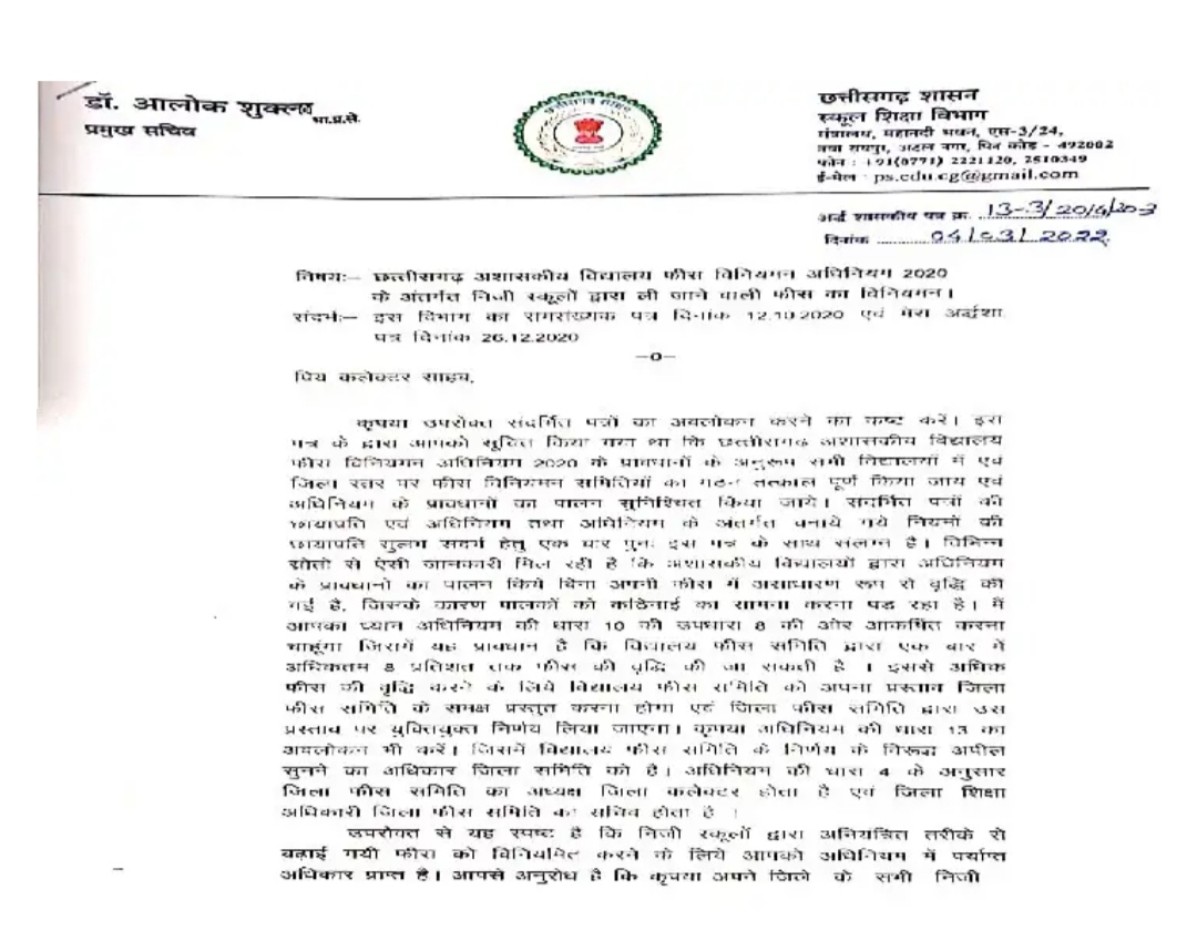 कलेक्टरों को जारी पत्र में कहा गया है कि जानकारी मिली है कि अशासकीय विद्यालयों की तरफ से अधिनियम के प्रावधानों का पालन किए बिना अपनी फीस में असाधारण रूप से वृद्धि की गई है, जिसके कारण अभिभावकों को कठिनाई का समाना करना पड़ रहा है. आलोक शुक्ला ने जिला कलेक्टरों को अधिनियम की धारा 10 की उपधारा 8 की ओर ध्यान आकर्षित करते हुए कहा है कि इसमें ये प्रावधान है कि विद्यालय फीस समिति द्वारा एक बार में अधिकतम 8 प्रतिशत की वृद्धि की जा सकती है. इससे अधिक फीस की वृद्धि करने के लिए विद्यालय फीस समिति को अपना प्रस्ताव जिला फीस समिति के समक्ष प्रस्तुत करना होगा।