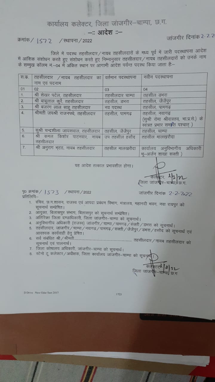जांजगीर-चांपा::जाज्वल्य न्यूज़::कलेक्टर जितेंद्र शुक्ला ने जिले में 5 तहसीलदार एवं 2 नायब तहसीलदार सहित एक साथ तबादला करते हुए आदेश जारी किया है जिसमें शेखर पटेल चांपा से डभरा बाबूलाल कुर्रे डभरा से जैजैपुर बजरंग लाल साहू तहसील पामगढ़ श्रीमती जयश्री राजपथे पामगढ़ से तहसील नवागढ़ (सुश्री रोमा श्रीवास्तव आईएएस) के स्वतंत्र प्रभार समाप्ति के पश्चात सुश्री चंद्रशिला जायसवाल जैजैपुर से चांपा कमल किशोर पाटनवार हसौद से मालखरौदा अनुराग भट्ट मालखरौदा से कार्यालय अनुविभागीय अधिकारी भू राजस्व शाखा सक्ति में नवीन पदस्थापना किया गया है।