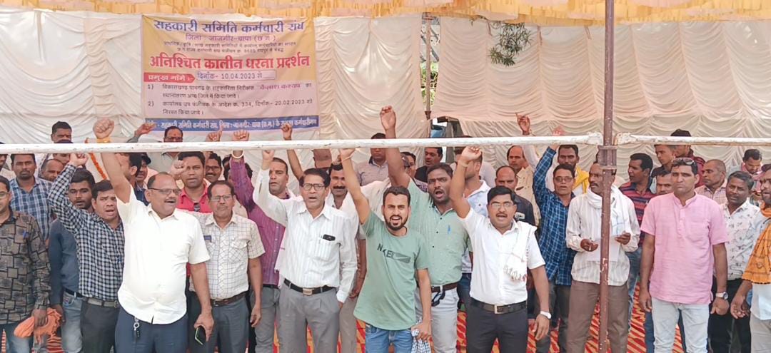 2 सूत्रीय मांगों को लेकर सहकारी कर्मचारी संघ बैठे धरने पर।