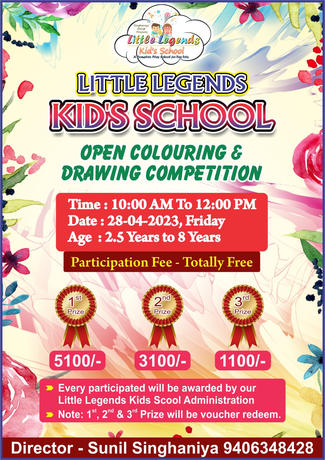 लीटिल लिजेन्ड्स किड्स किड्स स्कूल में ओपन निशुल्क कलरिंग एवं ड्रॉईंग कॉम्पटीशन का आयोजन आज।