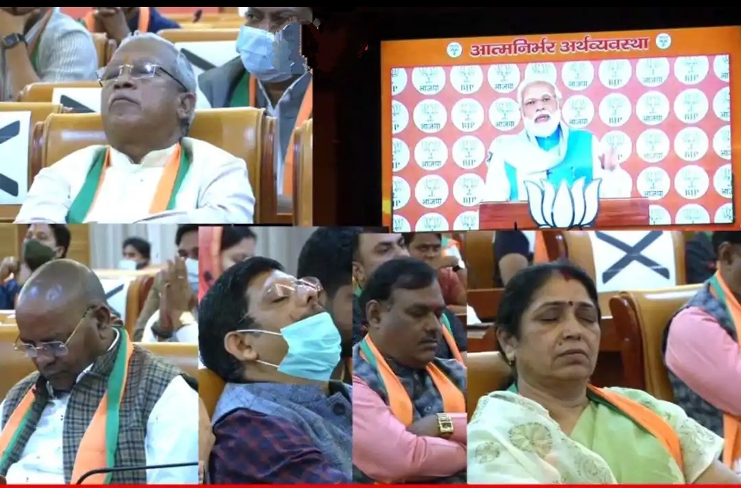पीएम के संबोधन के दौरान छत्तीसगढ़ सरकार के पूर्व मंत्री अजय चंद्राकर, पूर्व विधायक नंदे साहू, पूर्व संगठन महामंत्री राम प्रताप सिंह, पूर्व जिला पंचायत अध्यक्ष लक्ष्मी वर्मा सहित दर्जनभर से नेता और कार्यकर्ता सोते हुए दिखे. हैरानी की बात यह रही कि ये नेता अग्रीम पंक्ति में बैठकर भी बड़े आराम से टेका लगाकर सोते दिखे. बता दें कि आत्मनिर्भर अर्थव्यवस्था विषय पर बजट को लेकर प्रधानमंत्री नरेंद्र मोदी का संबोधन सुनने बीजेपी ने अलग-अलग विषय विशेषज्ञ सहित प्रोफेशनल्स को भी आमंत्रित किया था, जिसमें चार्टर्ड अकाउंटेंट, वरिष्ठ पत्रकार, समाजसेवी, कानून विद किसान प्रतिनिधि सहित अन्य शामिल थे. हैरानी की बात यह कि पीएम मोदी का संबोधन सुनने प्रिफेशनल्स को इनवाइट कर अजय चंद्राकर, राम प्रताप सिंह, नंदे साहू, लक्ष्मी वर्मा जैसे बड़े नेता खुद सो रहे थे.