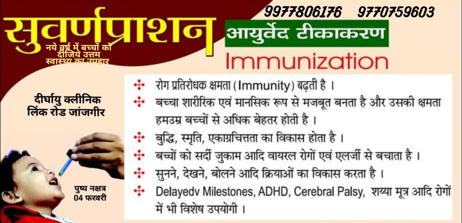डॉक्टर मंजू राठौर के नेतृत्व में आयुर्वेदिक इम्युनाइजेश के तहत बच्चों में रोग प्रतिरोधक क्षमता बढाने हेतु स्वर्ण बिंदु प्राशन संस्कार अति शुभ पुष्य नक्षत्र में 04 फरवरी आज दिन शनिवार को सुबह 10:00 बजे से रात्रि 8:00 बजे तक दीर्घायु क्लीनिक लिंक रोड जांजगीर में कराया जाएगा ।