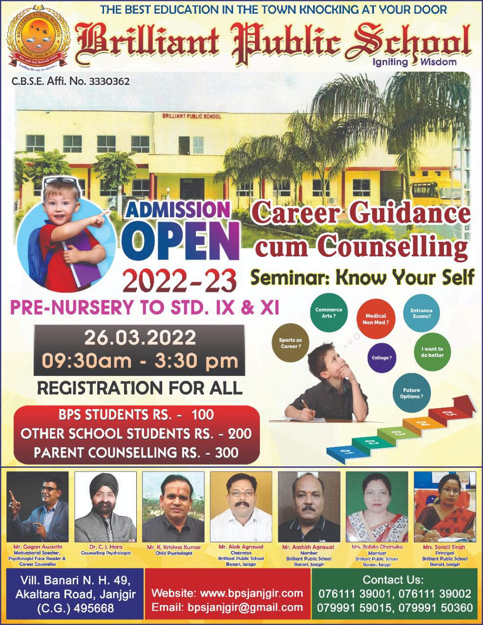 ब्रिलियंट पब्लिक स्कूल, बनारी, जाँजगीर में कैरियर गाइडेंस कम काउंसलींग सेमीनार का आयोजन किया। कौटिल्य ऐकडमी इंदौर से गगन अवस्थी प्रख्यात मोटीवेटर, मनौविज्ञानिक, कैरियर काउंसलर, इंदौर, सी. जे. होरा काउंसलिंग साइकोलोजिस्ट, के. कृष्ण कुमार चाईल्ड साइकोलोजिस्ट एवं शाररिक व मानसिक स्वास्थ्य विशेषज्ञों के उपस्थिति में दिनाँक – 26/03/2022 को विद्यालय में प्राचार्या श्रीमति सोनाली सिंह व डायरेक्टर आलोक अग्रवाल, सदस्य श्रीमती बबीता धानुका, आशीष कुमार अग्रवाल के सानिध्य में ब्रिलियंट पब्लिक स्कूल बनारी, जांजगीर में एक दिवसीय कैरियर गाइडेंस कम काउंसलींग सेमीनार का आयोजन किया जायेगा। इस सेमीनार के मुख्य विषय व्यवहार, लक्ष्य निर्धारण, स्मरण शक्ति में वृध्दि, समय प्रबंधन, दूरदर्शिता, कुशल वाकपटुता, दिशा निर्धारण एवं अन्य जीवन में प्राप्त सफलताओं पर बहुत ही सहज व सरल रूप से बच्चों को प्रेरित किया जायेगा।