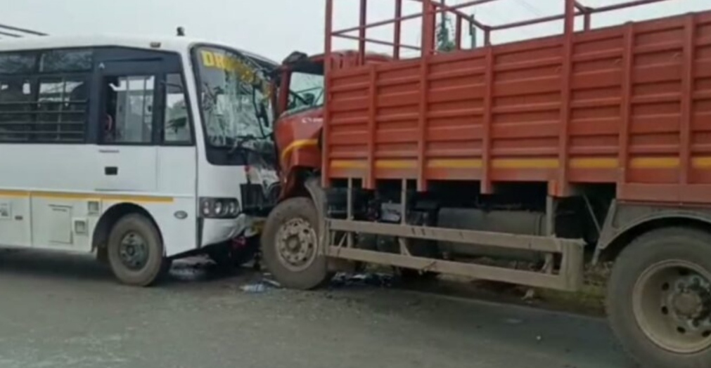 मुख्यमंत्री भूपेश बघेल के सुरक्षा में जा रहे पुलिस बस को ट्रक ने मारी ठोकर।