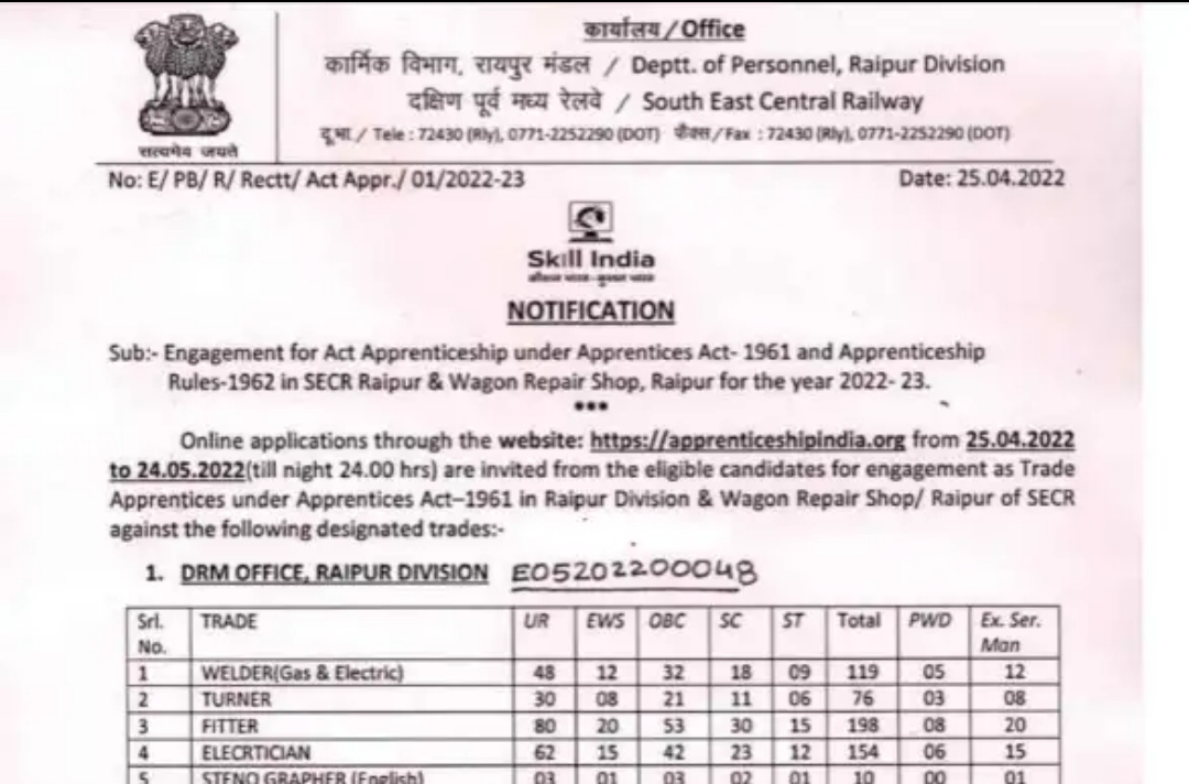 पदों का विवरण : दक्षिण पूर्व मध्य रेलवे ने अप्रेंटिस के 1033 पदों पर भर्ती को लेकर आवेदन मांगे हैं। आप फटाफट आवेदन को पूरा करें।