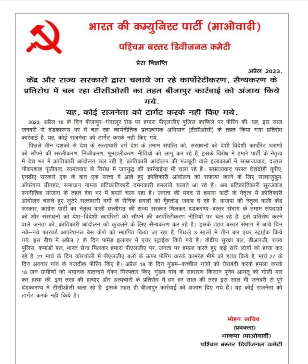 माओवादियों के पश्चिम बस्तर डिविजनल कमेटी के प्रवक्ता मोहन ने जारी किया प्रेस नोट जारी कर कहा–कोई राजनेता नही था उनके निशाने पर,पुलिस जवानों का काफिला समझकर की गई थी फायरिंग वही माओवादी नेता ने कहा TCOC के तहत किया गया था हमला,पर कोई राजनेता माओवादी नेता का आरोप–जनवरी माह से चल रहा है TCOC, इस दौरान जवानों ने कई फर्जी गिरफ्तारी और फर्जी मुठभेड़ों को दिया है अंजाम,इसी के खिलाफ दिया गया था हमले को अंजाम।