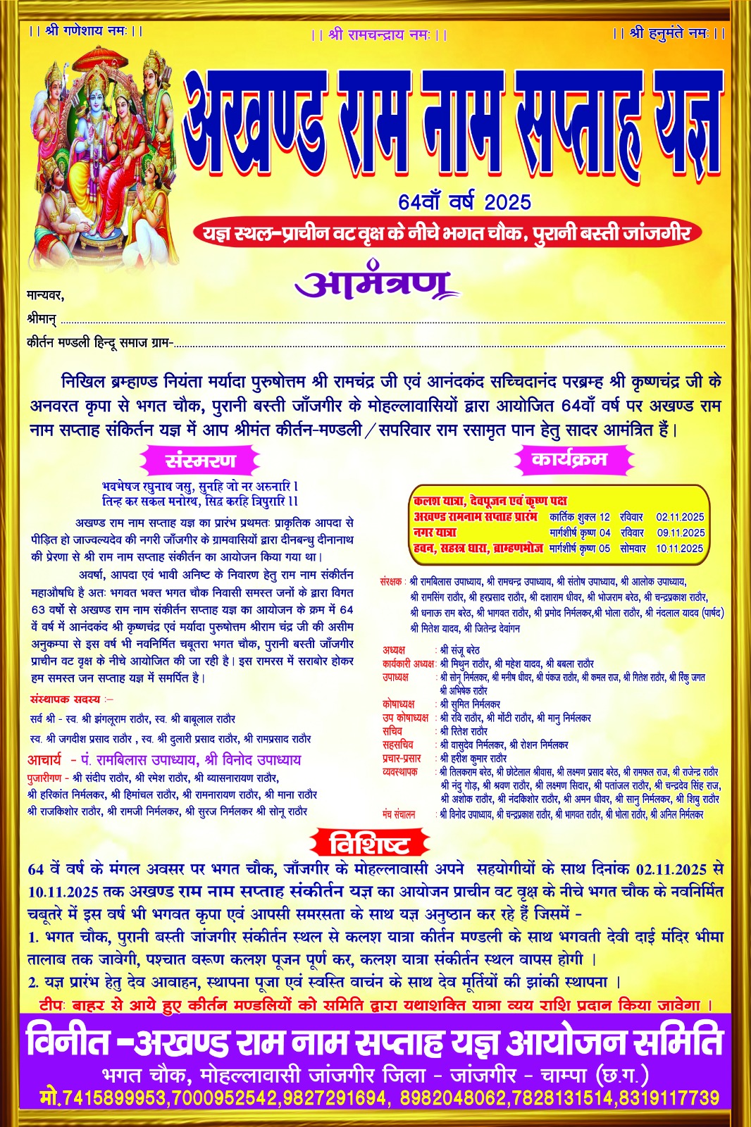 जांजगीर-चाम्पा जिला मुख्यालय के पुरानी बस्ती स्थित भगत चौक में सैकड़ों वर्ष पुराने विशाल वट वृक्ष के नीचे मोहल्लावासियों द्वारा विगत वर्षो की भांति 64 वाॅ वर्ष पर अखण्ड राम नाम सप्ताह यज्ञ का शुभारम्भ 2 नवम्बर से किया जायेगा। यज्ञ के प्रथम दिवस यज्ञ स्थल भगत चौक पुरानी बस्ती से कलश यात्रा कीर्तन मण्डली के साथ भगवती देवी दाई मंदिर भीमा तालाब तक निकाली जावेगी। तत्पश्चात वरूण कलश पूजन कर कलश यात्रा संकीर्तन स्थल वापस होगी। साथ ही यज्ञ प्रारंभ हेतु देव आवाह्नन, स्थापना पूजा एवं स्वास्ति वाचन के साथ देव मूर्तियों की झांकी स्थापना की जावेगी। विदित हो कि भगत चौक पुरानी बस्ती में 100 साल से अधिक विशाल वट वृक्ष के नीचे चबूतरे में पूरे सात दिन और सात रात राम नाम का जाप लगातार किया जाता है। वही जिले के सैकड़ो व अन्य जिलों के गांवों से कीर्तन मण्डली रामनाम की गायन करने मण्डली सहित पहुंचते है। यज्ञ का समापन 9 नवम्बर को किया जावेगा और उसी शाम भव्य नगर यात्रा भी निकाली जावेगी जहां श्रीकृष्ण राधा को पालकी में ऊठा पूरे नगर का भ्रमण कराया जावेगा। वही 10 नवम्बर को हवन, सहस्त्र धारा, ब्राम्हाण भोज का आयोजन किया जावेगा। आयोजन की तैयारी को अंतिम रूप देने समिति के संस्थापक, आचार्य, संरक्षक, अध्यक्ष, कार्यकारी अध्यक्ष, उपाध्यक्षगण, कोषाध्यक्ष, उप कोषाध्यक्ष, सचिव, सहसचिव, प्रचार-प्रसार अध्यक्ष, व्यवस्थापक, पुजारीगण, मंच संचालन प्रभारी सहित भगत चौक के निवासी जुटे हुए है।