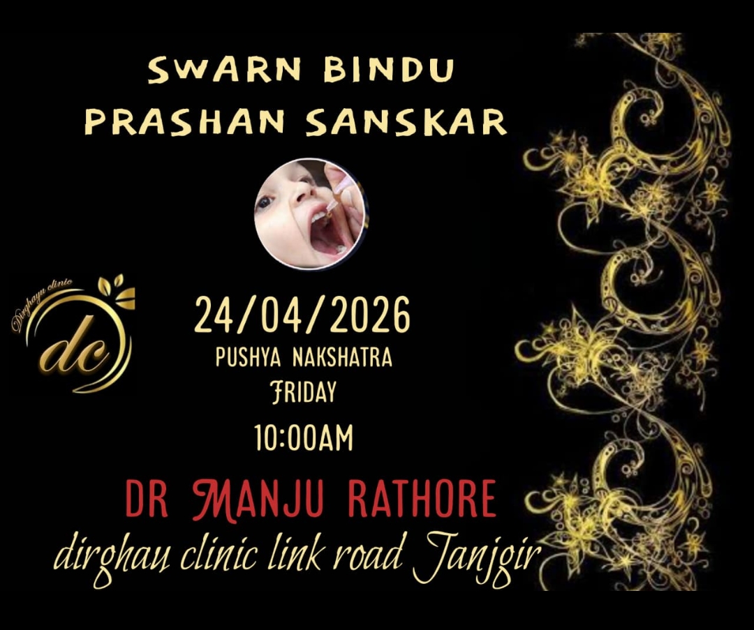 जांजगीर-चांपा:जिले के जांजगीर स्थित दिर्घायु क्लिनिक, लिंक रोड में 24 अप्रैल 2026, शुक्रवार को सुबह 10 से बजे स्वर्ण बिंदु प्राशन संस्कार का आयोजन किया जाएगा।