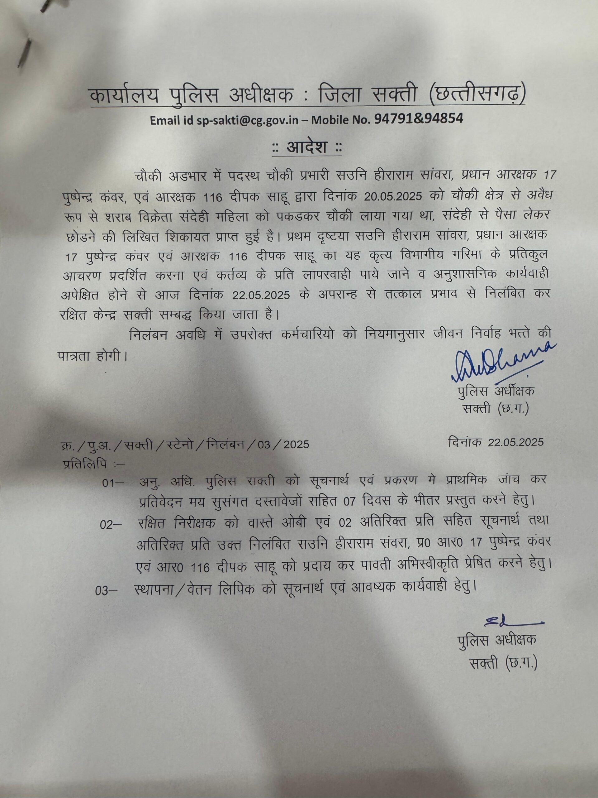 सक्ती (छत्तीसगढ़): जिले में पुलिस विभाग की छवि को धूमिल करने वाले भ्रष्ट पुलिसकर्मियों पर एसपी अंकिता शर्मा ने सख्त कार्रवाई करते हुए अड़भार चौकी प्रभारी समेत तीन पुलिसकर्मियों को तत्काल प्रभाव से सस्पेंड कर दिया है।कार्रवाई के तहत अड़भार चौकी प्रभारी सहायक उप निरीक्षक हीराराम सांवरा, प्रधान आरक्षक पुष्पेंद्र कंवर और आरक्षक दीपक साहू को सस्पेंड कर लाइन अटैच किया गया है।जानकारी के मुताबिक, अवैध शराब बेचने वाली एक महिला को पुलिस द्वारा पकड़ा गया था। परंतु आरोप है कि महिला को चौकी लाने के बाद लेनदेन कर उसे छोड़ दिया गया। इस मामले की शिकायत एसपी अंकिता शर्मा तक पहुंची, जिसके बाद उन्होंने तत्काल जांच के आदेश दिए और दोषी पाए जाने पर कार्रवाई की।एसपी ने स्पष्ट किया है कि पुलिस विभाग में भ्रष्टाचार किसी भी सूरत में बर्दाश्त नहीं किया जाएगा, और इस तरह के मामलों में आगे भी सख्त कदम उठाए जाएंगे।
