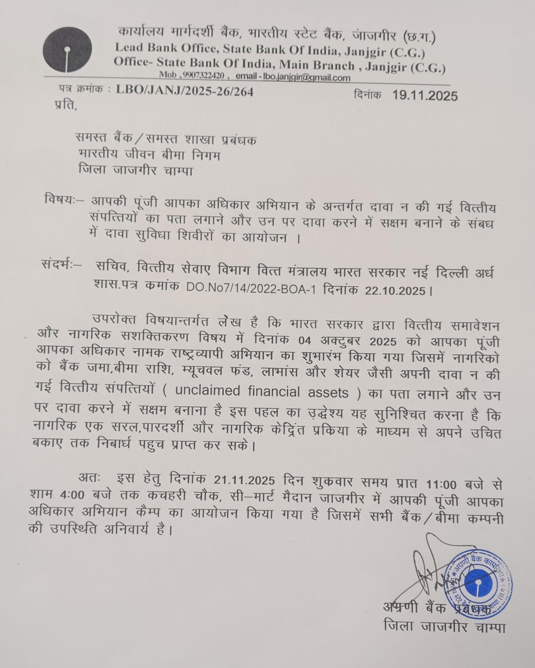 बैंक की पहल जांजगीर में आयोजित होगा ‘आपकी पूंजी आपका अधिकार’ शिविर, नागरिकों को अनक्लेम्ड वित्तीय संपत्तियों पर दावा करने में मिलेगी सुविधा।