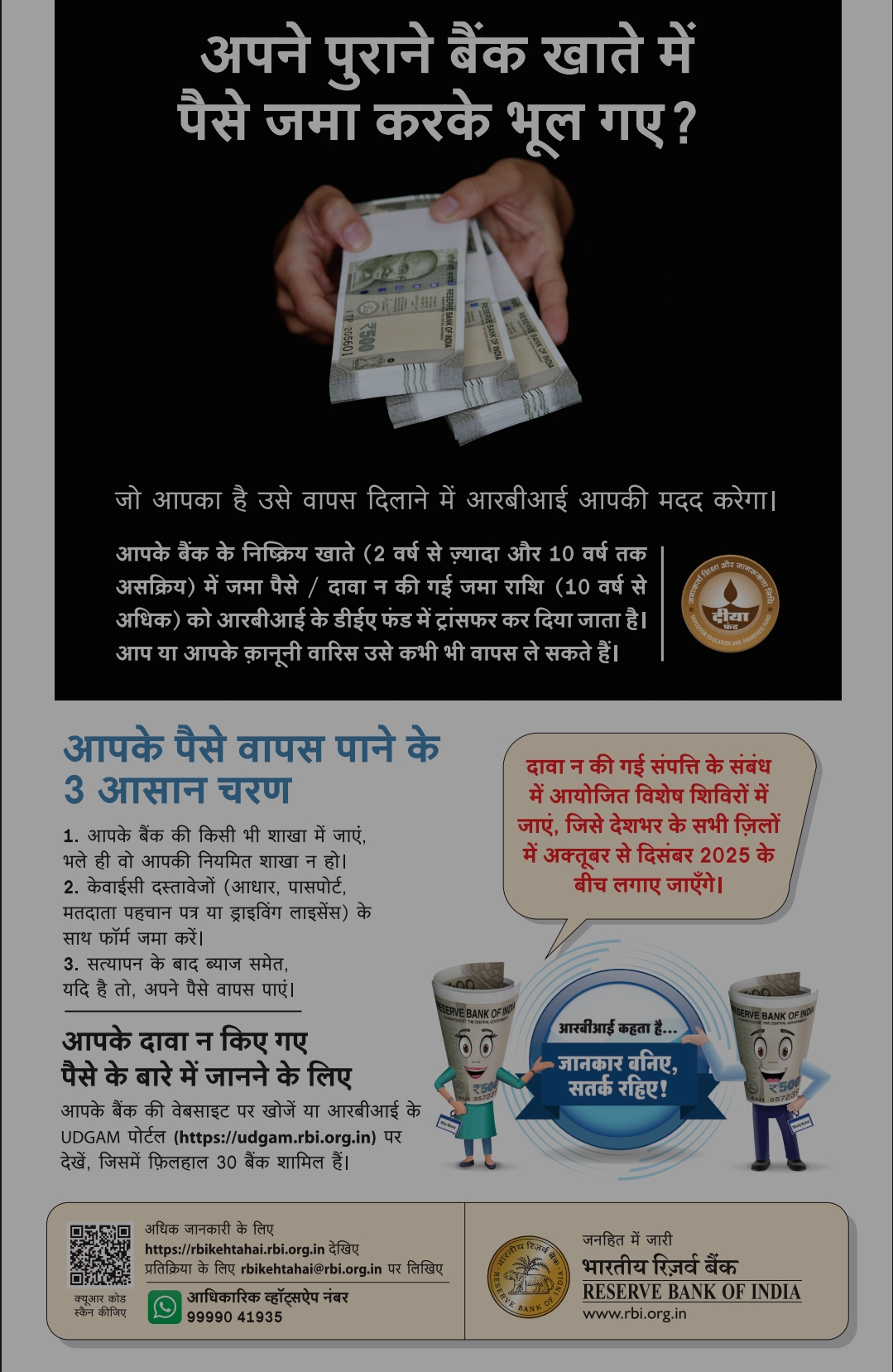 सरकार ने 4 अक्टूबर 2025 को इस अभियान की शुरुआत की थी, जिसका उद्देश्य उन वित्तीय संपत्तियों (Unclaimed Financial Assets) का पता लगाना है, जिन पर दावा नहीं किया गया है—जैसे बैंक जमा, बीमा राशि, म्यूचुअल फंड, लाभांश और शेयर आदि—और नागरिकों को इन पर दावा करने में सक्षम बनाना है।इसी उद्देश्य से जांजगीर में 21 नवंबर 2025 को शुक्रवार के दिन सुबह 11 बजे से शाम 4 बजे तक कचरघट चौराहा स्थित सी-मार्ट मैदान में दावा सुविधा शिविर आयोजित किया जाएगा। इस शिविर में बैंक और बीमा कंपनियों के प्रतिनिधि उपस्थित रहेंगे और नागरिकों को उनकी लंबित वित्तीय संपत्तियों के संबंध में जानकारी, जांच और दावा दर्ज करने की पूरी प्रक्रिया में सहायता प्रदान करेंगे।लीड बैंक प्रबंधक ने बताया कि यह पहल नागरिकों तक उनकी वैध वित्तीय संपत्तियाँ सरल और पारदर्शी प्रक्रिया से पहुंचाने की दिशा में महत्वपूर्ण कदम है। सभी नागरिकों से शिविर में पहुंचकर इसका लाभ लेने की अपील की गई है।