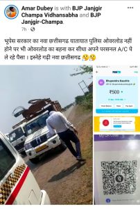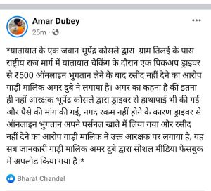 युवा मोर्चा के कार्यकर्ताओं का आरोप है कि यातायात विभाग के जवान भूपेंद्र कोसले द्वारा ग्राम तिलाई के पास चेंकिग के दौरान 500 रूपए आनलाइन भुगतान लेने के बाद रसीद नही देने का वीडियो सोशल मीडिया में वायरल हो गया। इससे यातायात विभाग की जमकर किरकिरी होनी शुरू हो गई। मामले में तूल पकड़ता देख यातायात विभाग के द्वारा चालान काटा गया है, लेकिन सरकारी चालान काटकर अपने निजी खाते में रूपए लेने की बात का युवामोर्चा में विरोध जताया है।