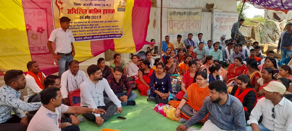 जाज्वल्य न्यूज़:: नवागढ़- छत्तीसगढ़ मनरेगा कर्मचारी महासंघ के बैनर तले जनपद पंचायत नवागढ़ अंतर्गत कार्यरत मनरेगा कर्मचारियों द्वारा पूर्व सूचना अनुसार 4 अप्रैल 2022 दिन सोमवार से अनिश्चितकालीन हड़ताल पर जाने का निर्णय लिया है और आज दूसरे दिन भी हड़ताल जारी रही, छत्तीसगढ़ प्रदेश में मनरेगा कर्मचारी लगभग 16 वर्षों से निरंतर अपनी सेवा दे रहे हैं बावजूद उसके उनकी आज तक किसी मांगों पर शासन प्रशासन ने ध्यान नहीं दिया है इससे पहले भी कुछ महीनों पूर्व हड़ताल के माध्यम से ज्ञापन सौंपते हुए मुख्यमंत्री भूपेश बघेल के चुनावी वादे को याद दिलाते हुए मांग किया गया था कि मनरेगा कर्मचारियों का भी नियमितीकरण किया जाए और उनका भी ग्रेड पे (वेतन) निर्धारित किया जाए, लेकिन पुनः चुनाव के दिन आने लगे हैं और अब तक उनकी मांगों को पूरा नहीं किया गया है ।
