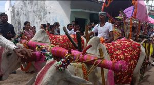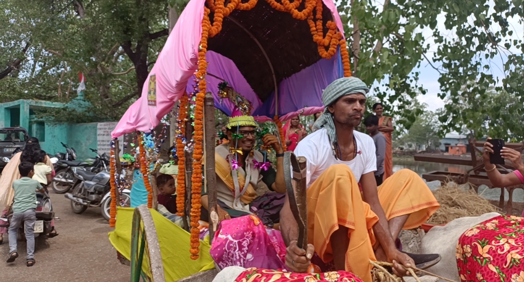 छत्तीसगढ़ के प्रमुख वाहन बैल गाड़ी में पागा लगा कर दूल्हा सवार निकला अनोखी बारात।