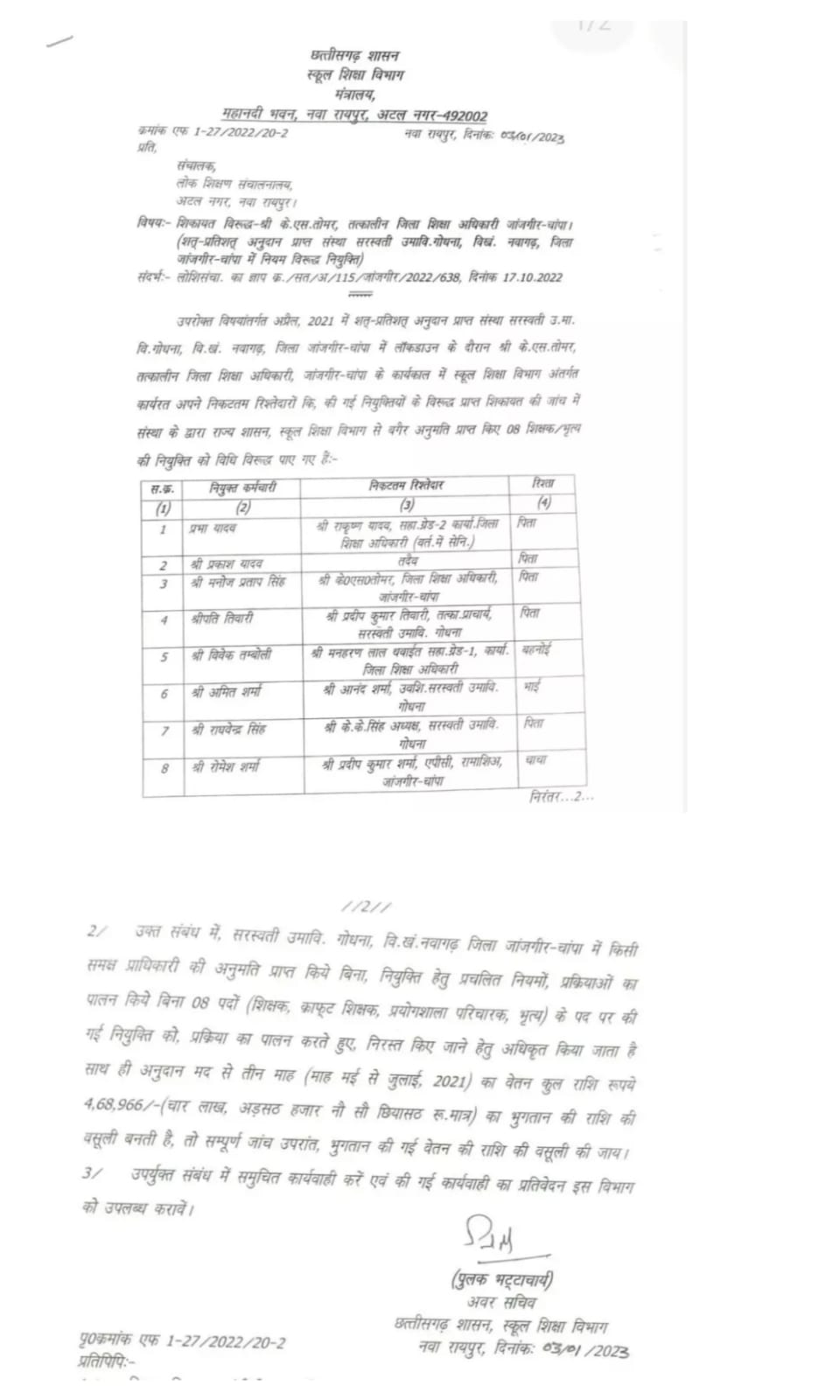 नवागढ़ विकासखंड में जिला शिक्षा अधिकारी केएस तोमर ने अपने कार्यकाल में शिक्षक, कॉफ्ट शिक्षक, प्रयोगशाला परिचारक व भृत्य के पदों पर भर्ती कर ली थी। जिसकी शिकायत करते हुए बताया गया था कि डीईओ ने स्कूल शिक्षा विभाग में कार्यरत लोगों के करीबी रिश्तेदारों की भर्ती नियम विरुद्ध तरीके से की है। जो जांच में सही पायी गयी।जिसमें उनपर कार्यवाही भी हुई थी। अब उन 8 कर्मियों को सेवा से पृथक करने और तीन माह में भुगतान की गई राशि 4,68,966 रुपये वसूल करने का आदेश जारी किया गया है।