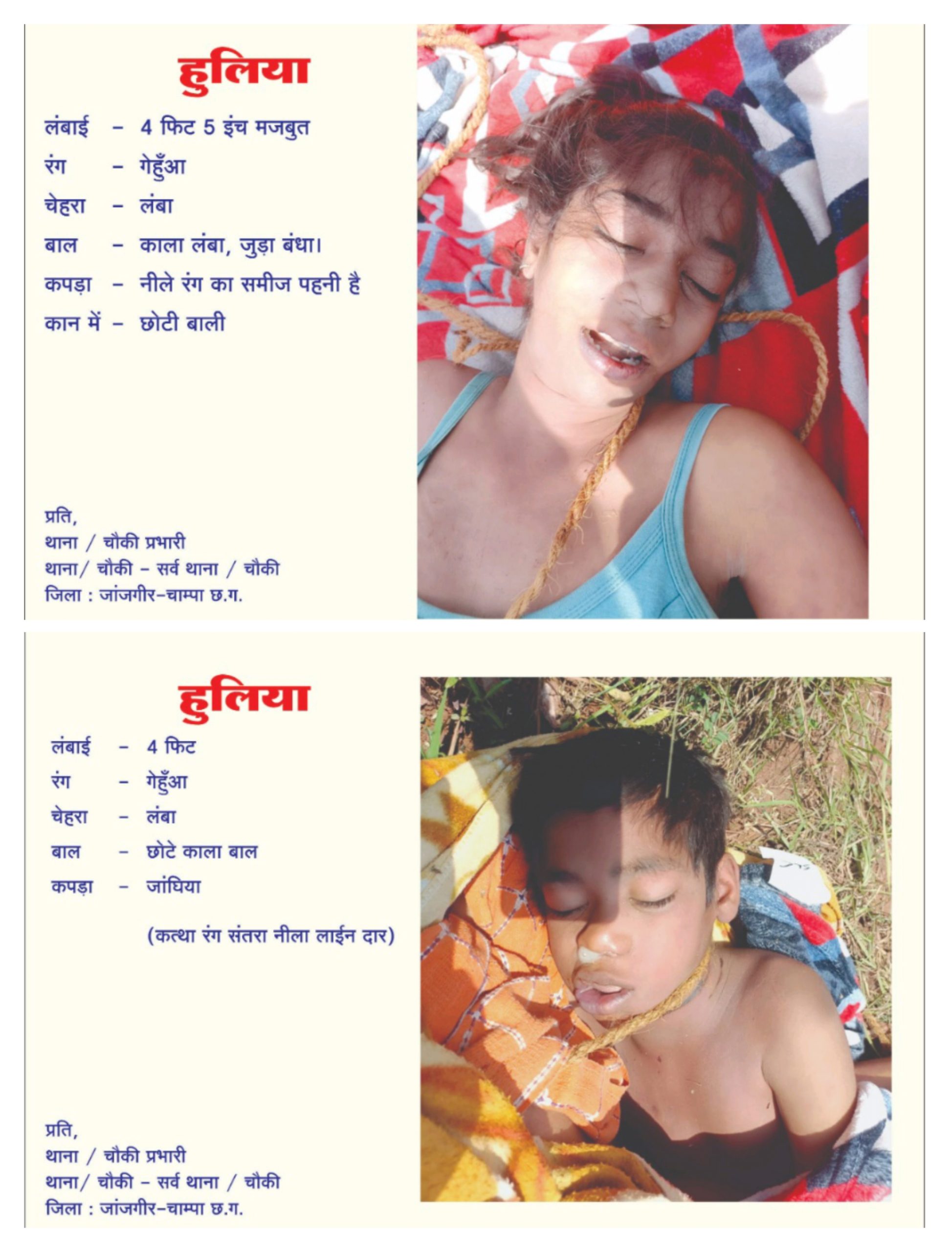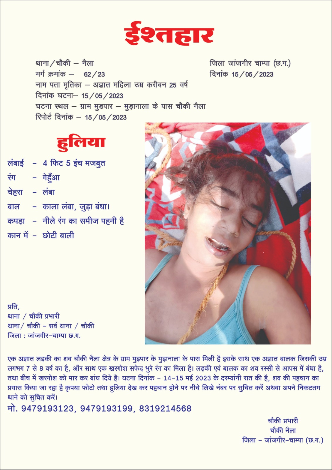 एक अज्ञात बालक का शव चौकी नैला क्षेत्र के ग्राम मुड़पार के मुड़ानाला के पास मिली है इसके साथ एक अज्ञात लड़की जिसकी उम्र लगभग 20 से 22 वर्ष की है, और साथ एक खरगोश सफेद भुरे रंग का मिला है। बालक एवं लड़की का शव रस्सी से आपस में बंधा है, तथा बीच में खरगोश को मार कर बांध दिये है। घटना दिनांक 14-15 मई 2023 के दरम्यांनी रात की है, शव की पहचान का प्रयास किया जा रहा है कृपया फोटो तथा हुलिया देख कर पहचान होने पर नीचे लिखे नंबर पर सुचित करें अथवा अपने निकटतम थाने को सुचित करें।