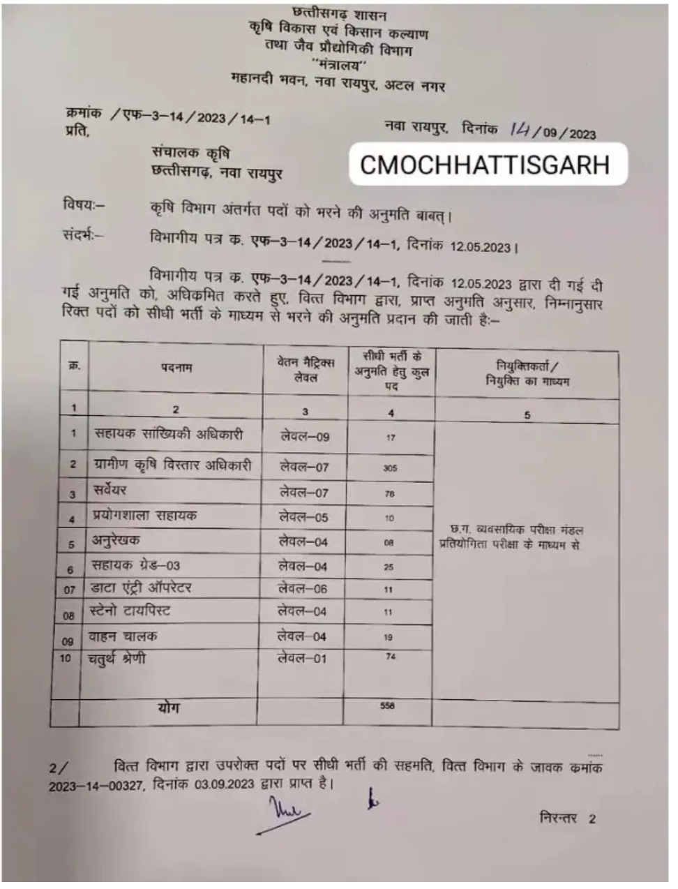 छत्तीसगढ़ सरकार ने युवाओं के लिए कृषि विभाग में 558 पदों पर भर्ती निकाली है। मुख्यमंत्री भूपेश बघेल के निर्देशानुसार कृषि विभाग में सहायक सांख्यिकी अधिकारी, ग्रामीण कृषि विकास अधिकारी, सर्वेयर, प्रयोगशाला सहायक, अनुरेखक, सहायक ग्रेड 3,डाटा एंट्री ऑपरेटर, स्टेनो, वाहन चालक और चतुर्थ श्रेणी के पदों पर भर्ती होगी।