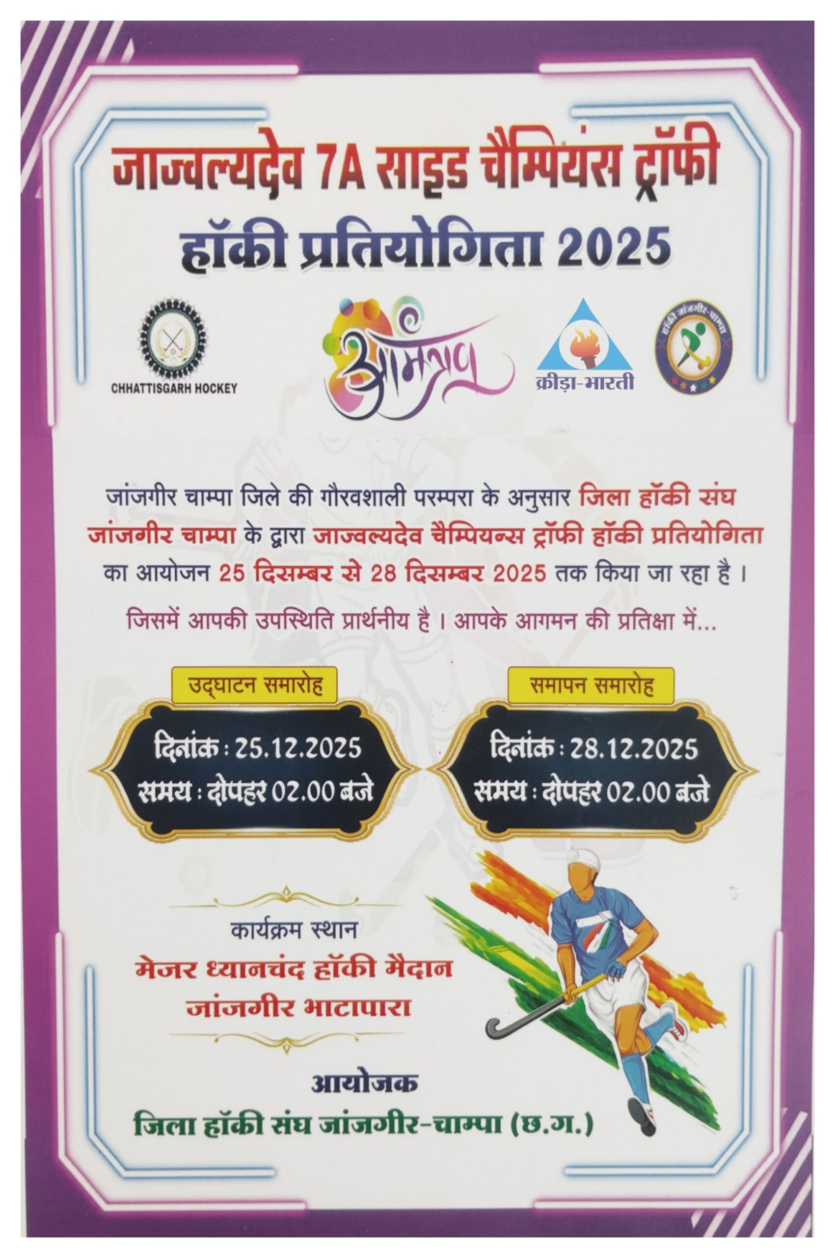 जांजगीर-चाम्पा। जिला हॉकी संघ जांजगीर-चाम्पा द्वारा मेजर ध्यानचंद हॉकी मैदान जांजगीर में जाजवल्य देव चैंपियंस टॉफी का आयोजन किया जा रहा है। इस प्रतियोगिता का उद्घाटन 28 दिसंबर को दोपहर एक बजे से किया जायेगा। इस प्रतियोगिता में पुरुष वर्ग की कुल आठ टीम महिला वर्ग की चार टीमें व सब जूनियर वर्ग की चार टीमें भाग लेंगी। प्रतियोगिता लीग कम नॉक आउट के आधार पर खेला जाएगा। हॉकी प्रतियोगिता का उद्घाटन नारायण चंदेल पूर्व नेता प्रतिपक्ष छत्तीसगढ़ विधानसभा करेंगे। कार्यक्रम में जनसेवक जांजगीर चांपा भाजपा नेता रवि पांडे, रेखा देवा गढ़ेवाल अध्यक्ष नगर पालिका परिषद जांजगीर नैला, आशुतोष गोस्वामी सांसद प्रतिनिधि व उपाध्यक्ष जांजगीर चांपा, मोहन यादव उपाध्यक्ष नगर पालिका परिषद जांजगीर नैला के कर कमलों से उद्घाटन समारोह संपादित होगा। जिला हॉकी संघ जांजगीर चांपा के टूर्नामेंट डायरेक्टर कृष्णा गढ़वाल , समन्वयक अरुण झाझडिया, संयोजक राजीव ठाकुर अध्यक्ष गोपेश्वर कहरा , राकेश गढ़वाल, कन्हैया यादव, टिंगा राम सारथी ,अजीत गढ़वाल , देवा गढ़वाल , चंद्रजीत सोनवान , दीपक खरसन, पुष्पेंद्र गढ़वाल , राजेश्वर कहरा, उमाशंकर चंद्रेश , राज कटकवार , सोमदेव कुमार , संजना साहू (NIS कोच) ,सीमा सोनवन एवम सभी सदस्यों ने इस अवसर पर सभी की उपस्थिति के लिए अनुरोध किया है कि अधिकाधिक संख्या में उपस्थित होकर कार्यक्रम को सफल बनाएं।