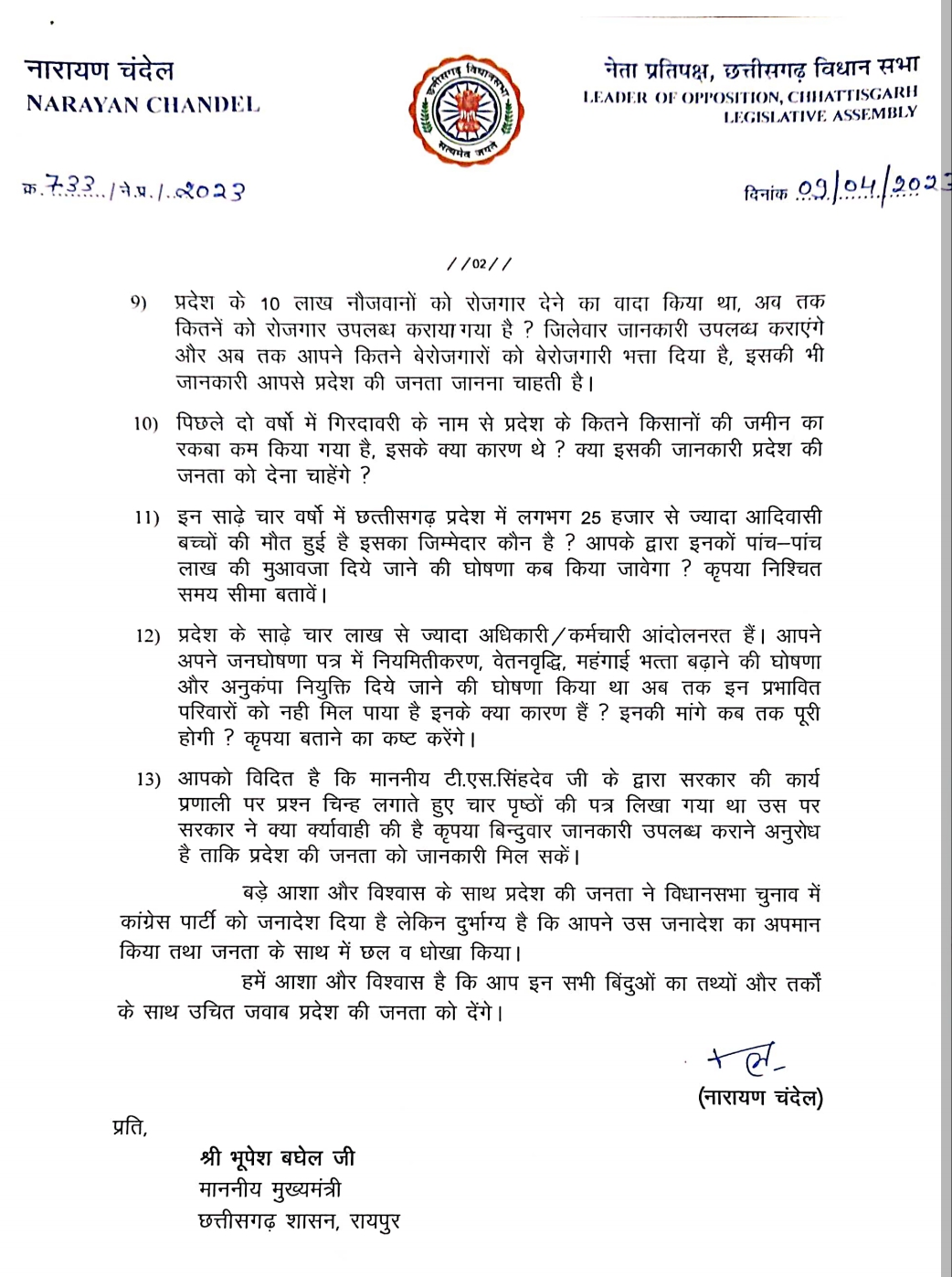 नेता प्रतिपक्ष नारायण चंदेल ने प्रदेश के मुख्यमंत्री भुपेश बघेल को लेटर लिखते हुए 13 बिंदु के जनहित मुद्दे को सरकार को याद दिलाते हुए जवाब मांगते हुऐ कहा कि कई योजनाओं में कितनी राशि उपलब्ध कराई और कहां उपयोग किया वह राज्य की आर्थिक स्थिति के अनुसार अभी तक राज्य सरकार ने कितना कर्ज लिया ब्याज सहित श्वेत पत्र जारी करने छत्तीसगढ़ के प्रत्येक व्यक्ति के ऊपर लगभग ₹27000 का कर्जा इस पर श्वेत पत्र जारी करने राज्य सरकार कोयले से प्रतिदिन ₹25 लेते थे के हिसाब से कितनी राशि जमा हुई प्रदेश में पूर्ण शराबबंदी की घोषणा के बाद अब तक विपार रहे जिसमें शराबबंदी कब तक करेंगे इसका निश्चित समय 16 लाख गरीब परिवार को प्रधानमंत्री आवास मिल जाए इसके लिए राज्य सरकार द्वारा अनुदान कब तक प्राप्त होगी नरवा गरवा घुरवा बाड़ी समेत राज्य सरकार द्वारा कितनी राशि बजट शामिल की गई प्रदेश के गठन में अब तक कितने गौ माता की हत्या मौत हुई इसके जिम्मेदार कौन है इसका जानकारी प्रदेश के 10लाख नौजवानों को रोजगार देने का वादा किया था अब तक कितने रोजगार उपलब्ध कराया पिछले 2 वर्षों में गिरदावरी के नाम पर प्रदेश के कितने किसानों की जमीन का रकबा कम किया जिसके लिए धान बेचने की शान भटकते रहे साडे 4 सालों में छत्तीसगढ़ प्रदेश के लगभग 25 हजार से ज्यादा आदिवासी बच्चों की मौत हुई इसका जिम्मेदार कौन मुआवजा के लिए कितनी घोषणाएं की प्रदेश के साढ़े 4 लाख से ज्यादा अधिकारी कर्मचारी आंदोलनरत रहे आपने जन घोषणापत्र में नियमितीकरण वेतन वृद्धि महंगाई भत्ता बढ़ाने की घोषणा अनुकंपा नियुक्ति सहित कितने प्रभावित परिवार को मिल पाया इसकी जानकारी माननीय श्री देव के द्वारा सरकार की कार्यप्रणाली पर प्रश्नचिन्ह लगाते हुए 4 पृष्ठों के पत्र लिखा उस पर सरकार की कार्यवाही बिंदुवार जानकारी नेता प्रतिपक्ष ने सवाल लगाते हुए मुख्यमंत्री से जवाब मांगा है।