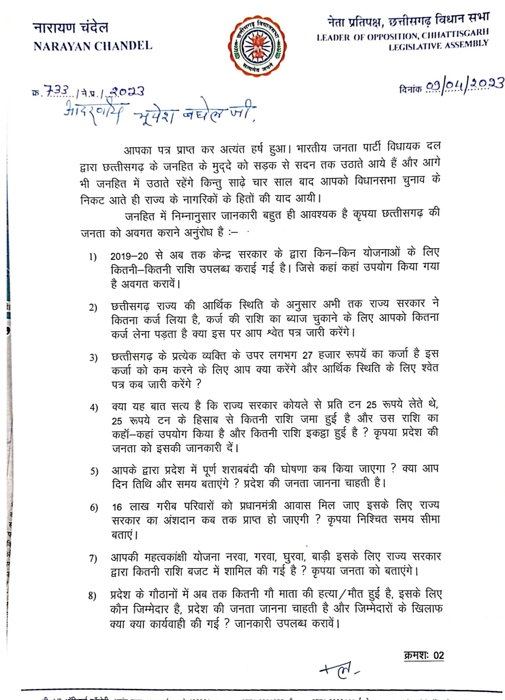 नेता प्रतिपक्ष नारायण चंदेल ने प्रदेश के मुख्यमंत्री भुपेश बघेल को लेटर लिखते हुए 13 बिंदु के जनहित मुद्दे को सरकार को याद दिलाते हुए जवाब मांगते हुऐ कहा कि कई योजनाओं में कितनी राशि उपलब्ध कराई और कहां उपयोग किया वह राज्य की आर्थिक स्थिति के अनुसार अभी तक राज्य सरकार ने कितना कर्ज लिया ब्याज सहित श्वेत पत्र जारी करने छत्तीसगढ़ के प्रत्येक व्यक्ति के ऊपर लगभग ₹27000 का कर्जा इस पर श्वेत पत्र जारी करने राज्य सरकार कोयले से प्रतिदिन ₹25 लेते थे के हिसाब से कितनी राशि जमा हुई प्रदेश में पूर्ण शराबबंदी की घोषणा के बाद अब तक विपार रहे जिसमें शराबबंदी कब तक करेंगे इसका निश्चित समय 16 लाख गरीब परिवार को प्रधानमंत्री आवास मिल जाए इसके लिए राज्य सरकार द्वारा अनुदान कब तक प्राप्त होगी नरवा गरवा घुरवा बाड़ी समेत राज्य सरकार द्वारा कितनी राशि बजट शामिल की गई प्रदेश के गठन में अब तक कितने गौ माता की हत्या मौत हुई इसके जिम्मेदार कौन है इसका जानकारी प्रदेश के 10लाख नौजवानों को रोजगार देने का वादा किया था अब तक कितने रोजगार उपलब्ध कराया पिछले 2 वर्षों में गिरदावरी के नाम पर प्रदेश के कितने किसानों की जमीन का रकबा कम किया जिसके लिए धान बेचने की शान भटकते रहे साडे 4 सालों में छत्तीसगढ़ प्रदेश के लगभग 25 हजार से ज्यादा आदिवासी बच्चों की मौत हुई इसका जिम्मेदार कौन मुआवजा के लिए कितनी घोषणाएं की प्रदेश के साढ़े 4 लाख से ज्यादा अधिकारी कर्मचारी आंदोलनरत रहे आपने जन घोषणापत्र में नियमितीकरण वेतन वृद्धि महंगाई भत्ता बढ़ाने की घोषणा अनुकंपा नियुक्ति सहित कितने प्रभावित परिवार को मिल पाया इसकी जानकारी माननीय श्री देव के द्वारा सरकार की कार्यप्रणाली पर प्रश्नचिन्ह लगाते हुए 4 पृष्ठों के पत्र लिखा उस पर सरकार की कार्यवाही बिंदुवार जानकारी नेता प्रतिपक्ष ने सवाल लगाते हुए मुख्यमंत्री से जवाब मांगा है।
