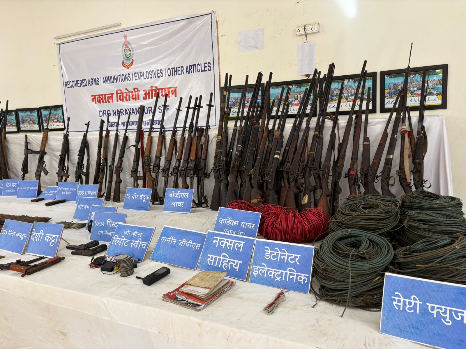 नारायणपुर, 29 अगस्त 2025 जिला नारायणपुर में पुलिस द्वारा संचालित संयुक्त नक्सल विरोधी ‘‘माड़ बचाव’’ अभियान में सुरक्षा बलों को बड़ी सफलता मिली है। थाना कोहकामेटा क्षेत्रान्तर्गत अबूझमाड़ के जंगल-पहाड़ में माड़ डिवीजन के माओवादियों के साथ सुरक्षा बलों की मुठभेड़ हुई। मुठभेड़ में हथियारबंद सीनियर कैडर नक्सली भारी मात्रा में विस्फोटक और दैनिक उपयोगी सामग्री छोड़कर भाग निकले।इस दौरान LMG, AK-47 (त्रिची), इंसास, SLR, स्टेन गन, पिस्टल, मोटार्र जैसे अत्याधुनिक हथियारों के साथ ही BGL सेल, डेटोनेटर, ग्रेनेड, नक्सली साहित्य और 300 से अधिक सामग्री बरामद की गई है। अधिकारियों के अनुसार, मुठभेड़ में बड़ी संख्या में नक्सलियों के घायल होने की प्रबल संभावना है।