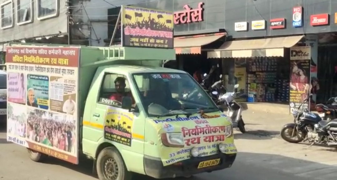 जांजगीर_चांपा 16/05/2023_ छत्तीसगढ़ सर्व विभागीय संविदा कर्मचारी संघ के बैनर तले राज्य के सभी विभागों में कार्यरत संविदा कर्मचारी साढ़े चार साल बाद भी जन घोषणा पत्र में किए जाने को गैर लोकतांत्रिक बताते हुए तत्काल नियमितिकरण के वादे को पूरा करने 16 मई को जांजगीर चापा के शिवरी नारायण से संविदा नियमितिकरण रथयात्रा निकालकर आंदोलन का आगाज किया। यह रथ 33 जिलों में सरकार के चुनाव के पूर्ण किए हुए वादे को पूरा करने हेतु कलेक्टर को ज्ञापन सौंपेंगे। यात्रा का नेतृत्व महासंघ के प्रांताध्यक्ष कौशलेश तिवारी सहित कार्यकारी अध्यक्ष हेमंत सिन्हा, महासचिव श्रीकांत लास्कर, प्रांतीय संगठन मंत्री ताकेश्वर साहू, अजय क्षत्रिय एवं अन्य सद्स्यों के शुरू किया।