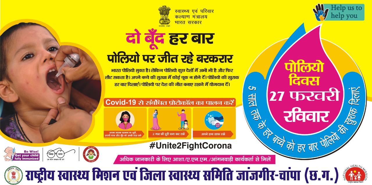 कलेक्टर जितेन्द्र कुमार शुक्ला एवं मुख्य चिकित्सा एवं स्वास्थ्य अधिकारी डॉ. एस. आर. बंजारे द्वारा आम नागरिकों से अपील कर कहा है कि अपने निर्धारित आयु के बच्चों को पोलियों कि दो बूंद दवा पिलाकर जिले को पोलियो मुक्त अभियान सफल बनाने अपना अमूल्य योगदान दें।