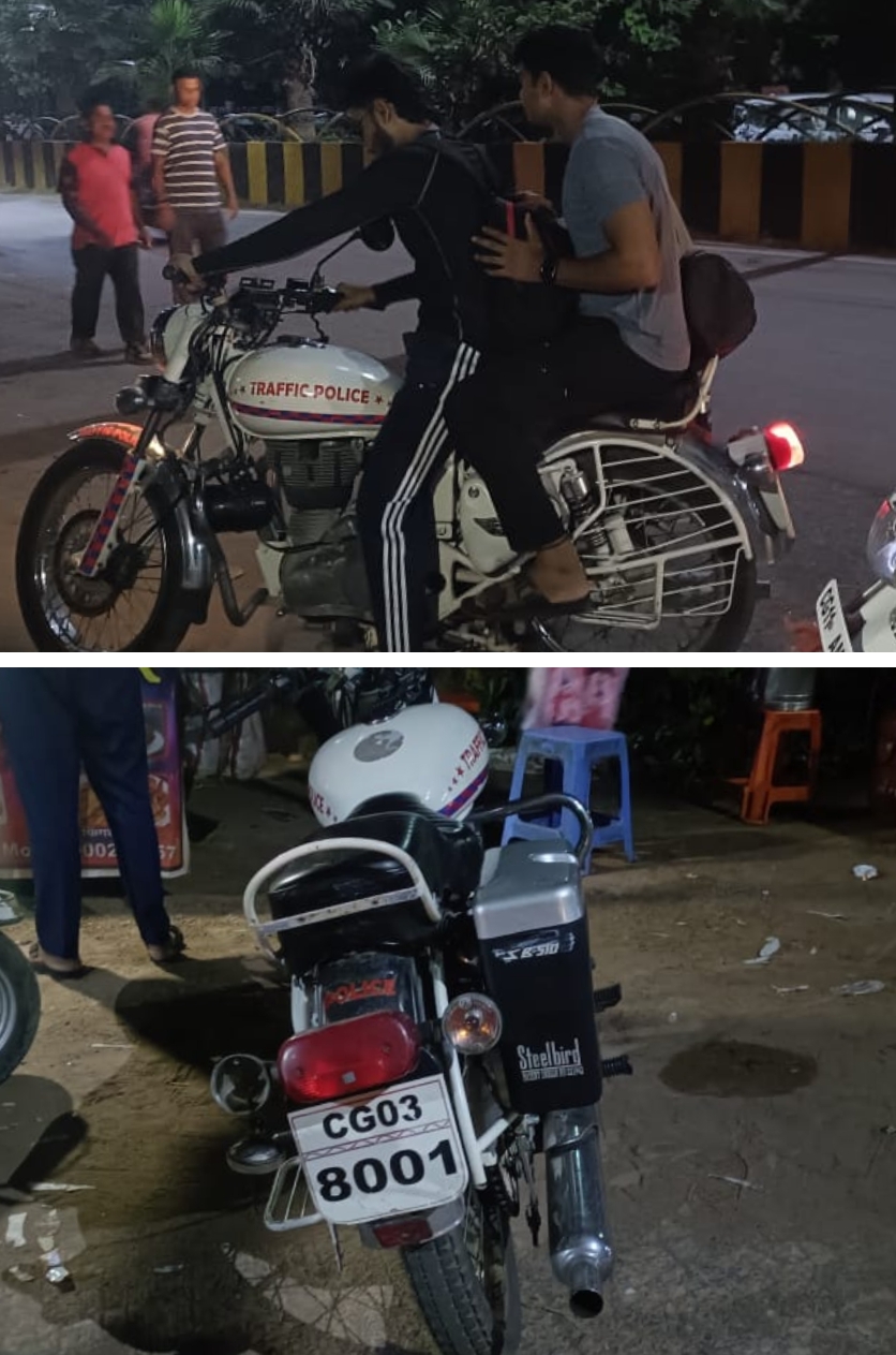 CG–03–8001 नंबर का सरकारी दोपहिया वाहन… जिस पर साफ-साफ “ट्रैफिक” लिखा है…हैंडल पर न कोई जवान… न ड्रेस… न हेलमेट… बल्कि जवान का लाडला बेटा, बेखौफ सड़कों पर फर्राटे भर रहा है।