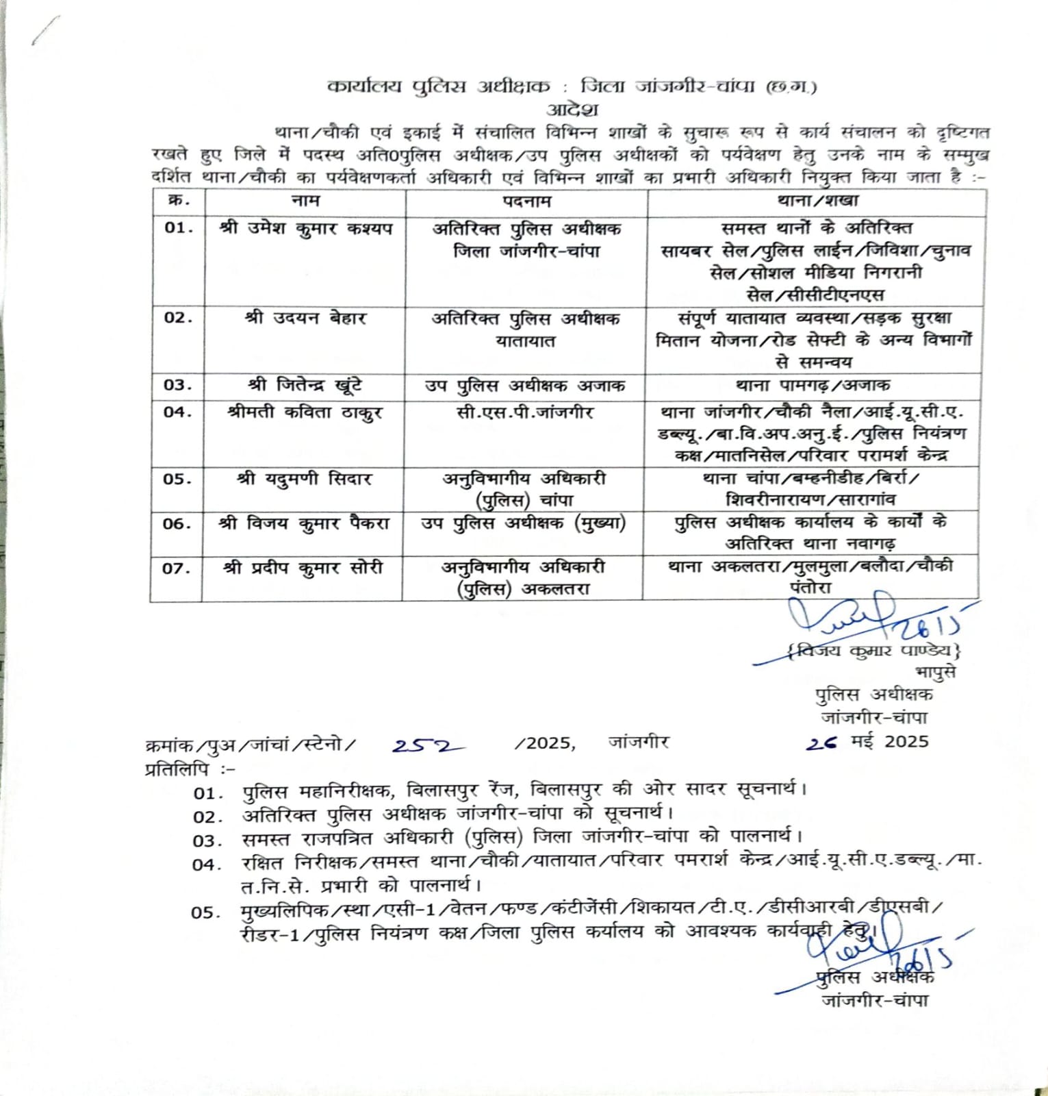 श्रीमती कविता ठाकुर (सीएसपी, जांजगीर) – थाना जांजगीर, चौकी नैला, IOC डब्लू, पुलिस नियंत्रण कक्ष, साइबर सेल एवं परिवार परामर्श केंद्र की देखरेख।